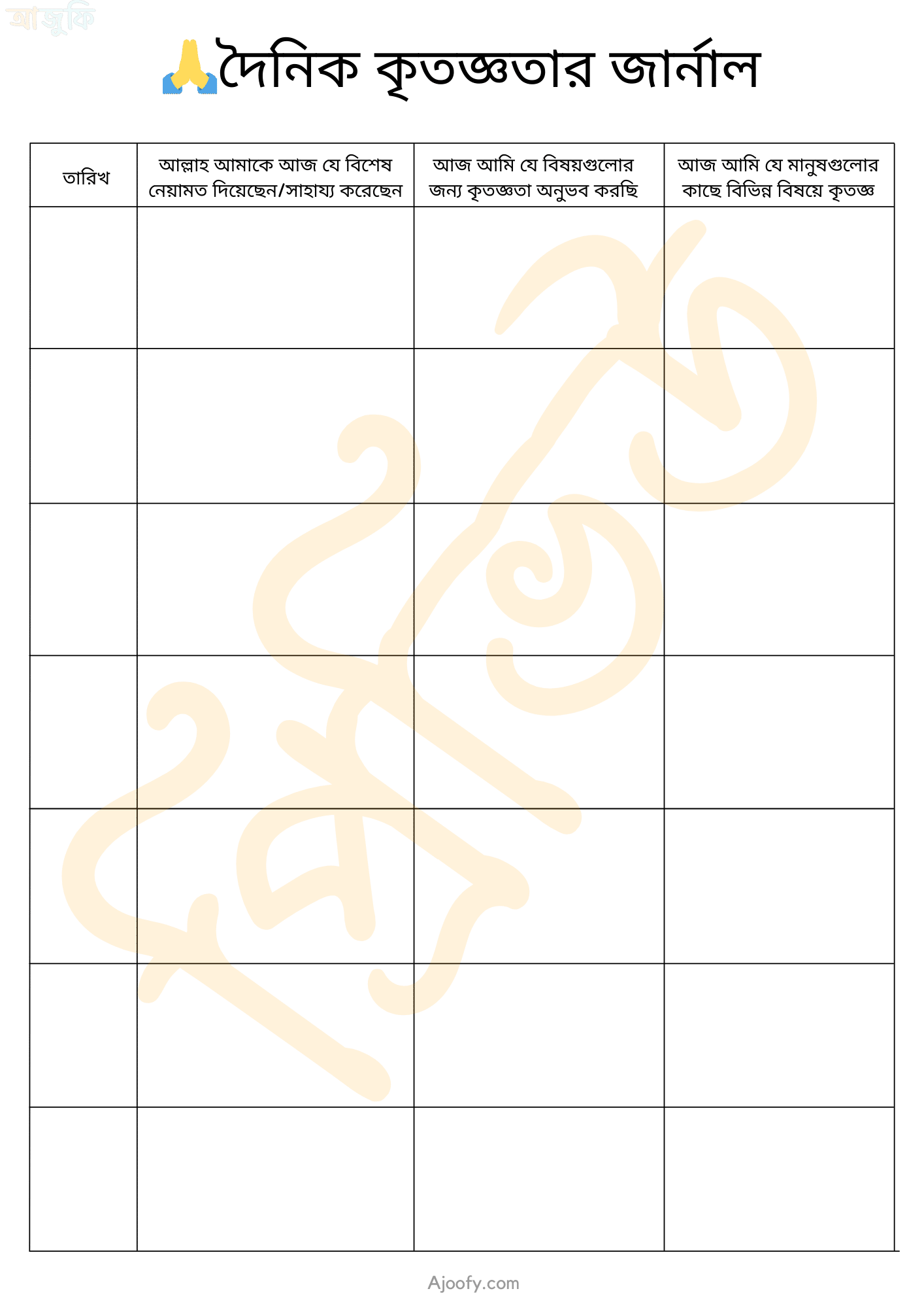 ✅ দৈনিক টেমপ্লেট – তারিখ, আল্লাহর নিয়ামত, আজকের কৃতজ্ঞতা, প্রিয়জন।