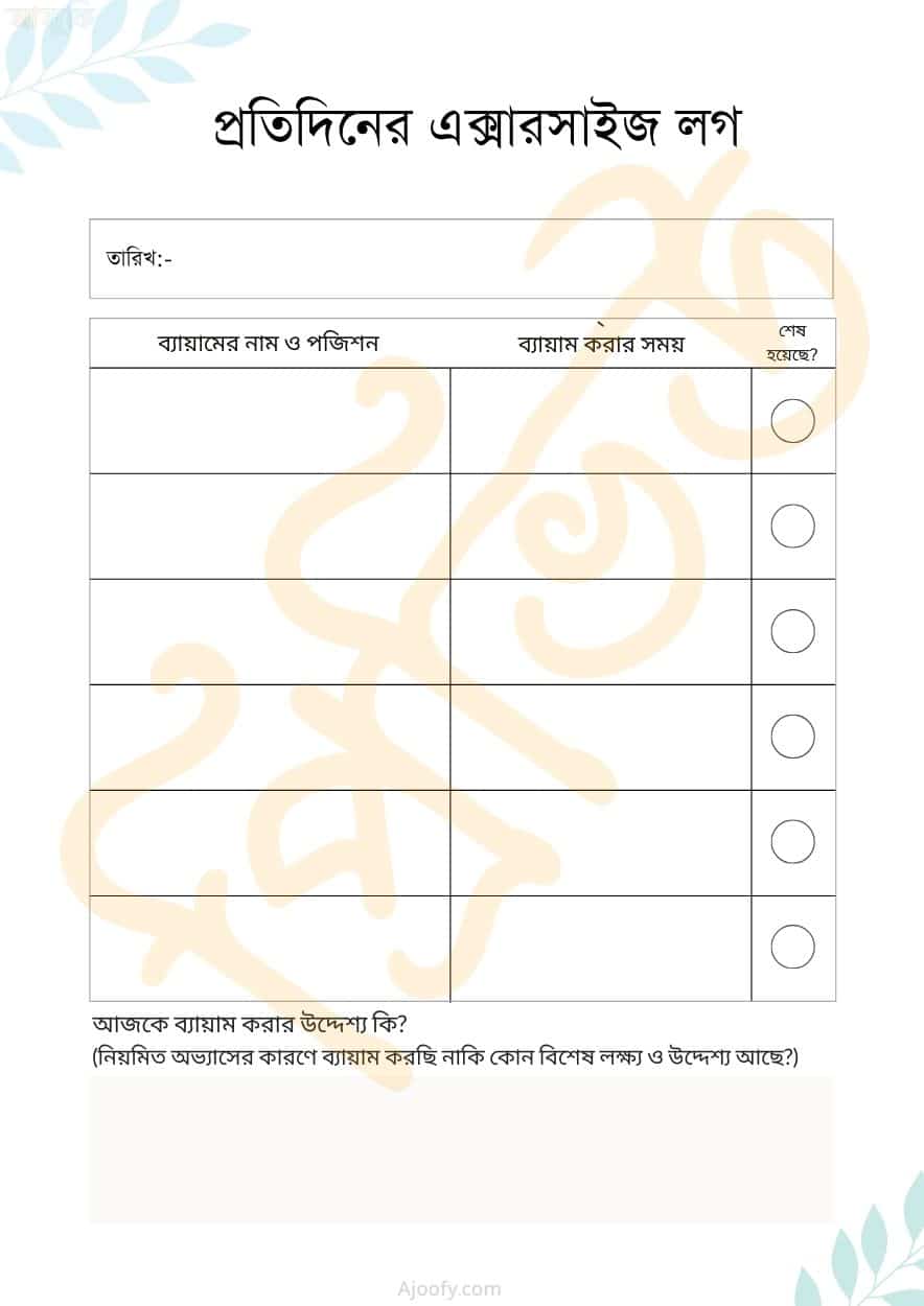 এটি কেবল একটি জার্নাল নয়, বরং একজন ব্যক্তির ব্যায়াম করার অভ্যাসকে তার শরীর, সময়, এবং লক্ষ্যের সাথে মানিয়ে নিতে সাহায্য করবে। এটি নিয়মিতভাবে ব্যবহার করলে ব্যায়াম করার অভ্যাস গড়ে উঠতে সাহায্যকারী হবে।