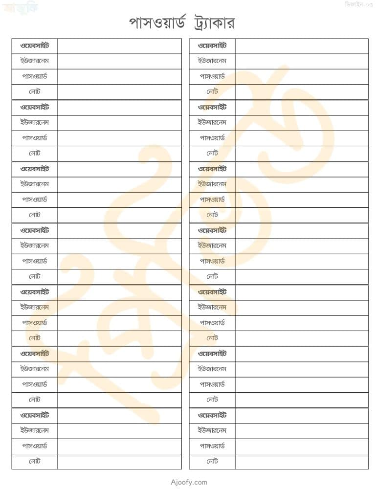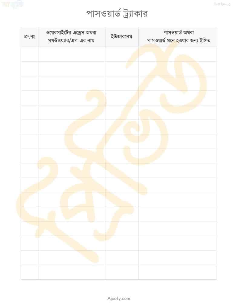 ৩। ছকের মধ্যে তথ্য লিখে Tracker টি সযত্নে সংরক্ষণ করবেন যেন যে কেউ আপনার এই সেনসিটিভ তথ্যগুলো না পেয়ে যায়।