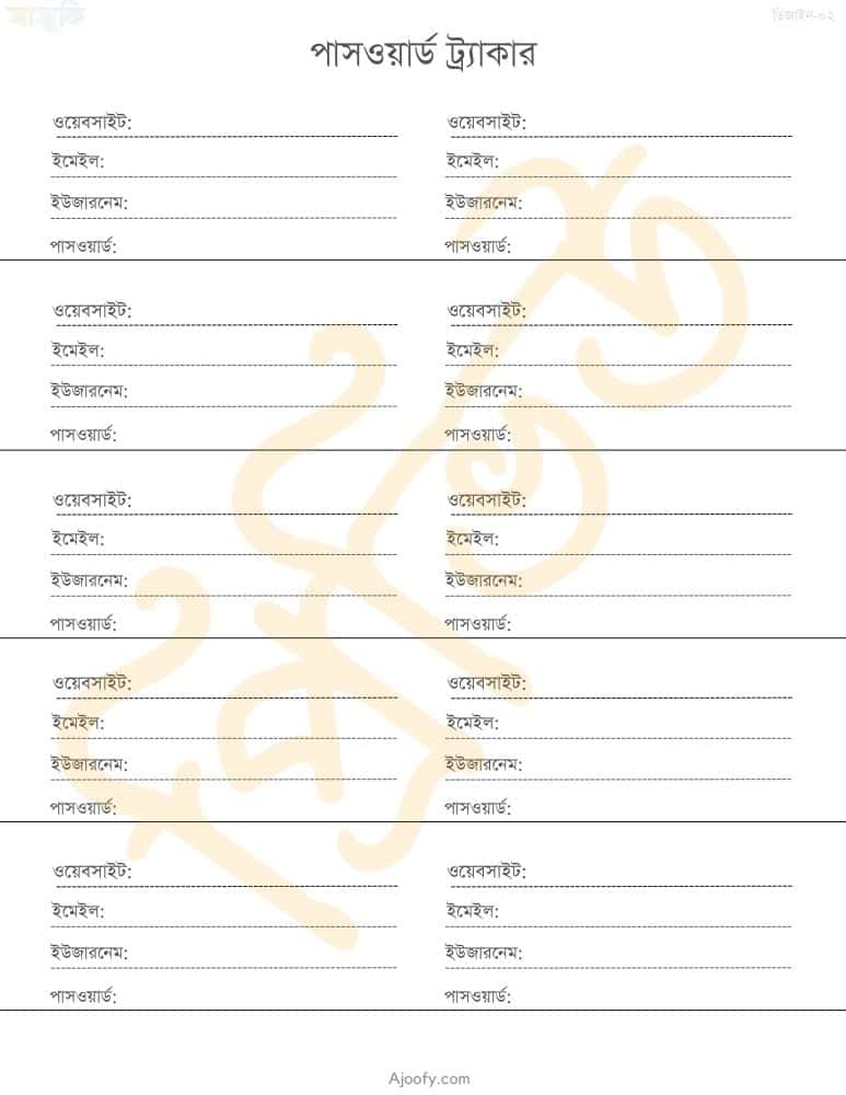 সেদিন তার ছোট ভাইয়ের কথা শুনে রফিক Ajoofy.com থেকে পাসওয়ার্ড ট্র্যাকার ডাউনলোড ও প্রিন্ট করে তার সমস্ত পাসওয়ার্ডগুলো সরাসরি না লিখে Hints দিয়ে লিখে ফেললো যেন কেউ তার পাসওয়ার্ডগুলো না বুঝতে পারে